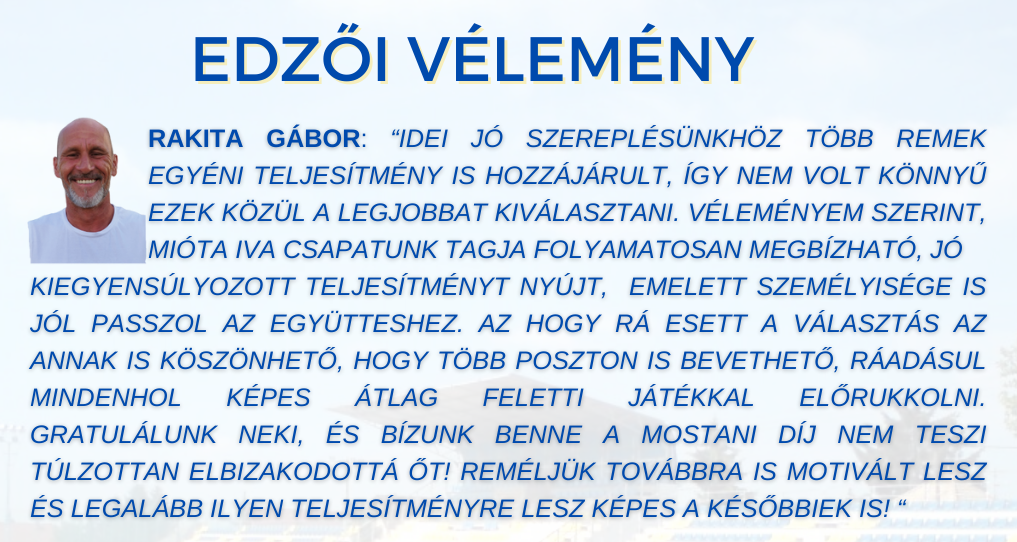 Mikor kiderült három ember között dől el, sejtettem, hogy benne vagyok, de hogy én kapom arra nem számítottam. Jó páran megérdemelték volna, ezért is esett rendkívül jól, hogy remek játékosok közül végül is kaphattam meg. Nem szeretem a játékomat értékelni, de így visszagondolva nyilván nekem is voltak gyengébb meccseim, de összességében kiegyensúlyozott teljesítményt nyújtottam és a visszajelzések alapján hozzá tudtam tenni a csapat eredményességéhez.