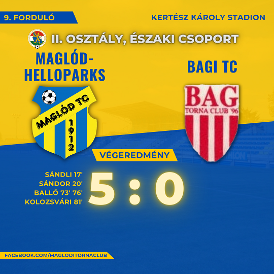 Három hetes túrájából hazatérve újra nagyarányú győzelmet aratott felnőtt csapatunk és immár egy éve veretlen hazai pályán bajnoki mérkőzésen. A Bag ellen találkozó első percétől kezdeményezően játszott együttesünk, sorra alakítottuk ki a helyzeteket, amiből az első játék rész közepén előbb Sándli, majd egy gyorsan elvégzett szabadrúgás után Sándor János volt eredményes. Ezt követően is több kecsegtető lehetőségünk akadt, de a kapu előtt –talán a biztos vezetés tudatában- már kevésbé voltunk pontosak. Szünet után is folytattuk első félidei játékunkat sajnos a pontatlansággal együtt. Balló Harold beállásával viszont sokat javult az eredményességünk, hiszen a reaktivált támadó legalább a kipattanó labdákra kegyetlenül lecsapott és gyorsan, a beállása néhány perccel kétszer is eredményes tudott lenni. A hajrában aztán az utóbbi időben gólínségben szenvedő Kolozsvári László is gólt tudott szerezni, így végül öt gólos sikert arattunk. Győzelmünk ilyen különbséggel is teljesen megérdemelt, igaz ehhez kellett egy a valós tudásánál sokkal haloványabban teljesítő bagi együttes is. Jövő héten bizonyára sokkal nehezebb dolgunk lesz a mindössze kettő pontot veszítő, második helyen álló Pomáz vendégeként, viszont ha sikerrel vesszük az akadályt, vérmesebb álmaink is lehetnek a bajnokság végkimenetelét illetően. A mai találkozóval kapcsolatban mindenképpen meg kell említeni a fiatal Szalai Milán játékát, aki bajnoki mérkőzésen először kapott lehetőséget a kezdő csapat tagjaként. Fiatal tehetségünk rendkívül fegyelmezetten és hasznosan futballozott a középpálya tengelyében, egyértelműen bizonyította, hogy bátran számíthatunk rá akár a későbbiekben is.