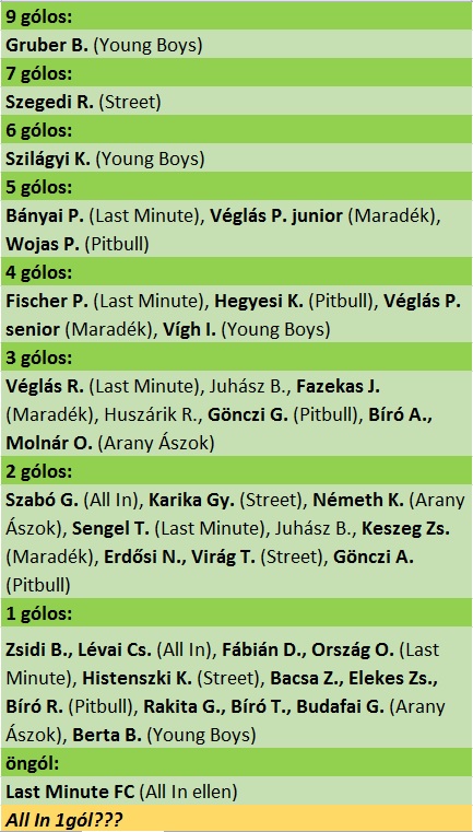 A karácsony előtti forduló kis híján meglepetéssel indult, hiszen az újonc Last Minute már 4-1-re is vezetett az All In gárdája ellen, ám végül a rutinos Szabó Gáborék a maguk javára fordították a mérkőzést. Ha elsőre nem is, a második találkozóra azért összejött a váratlan eredmény. A négy gólt szerző, ifjabbik Véglás Pál vezérletével győzni tudott a Maradék a Young Boys ellen. A harmadik összecsapás is meglepetést hozott, hiszen a másik újonc Street FC, ha csak egy góllal is, de megverte az élen álló Pitbull gárdáját.