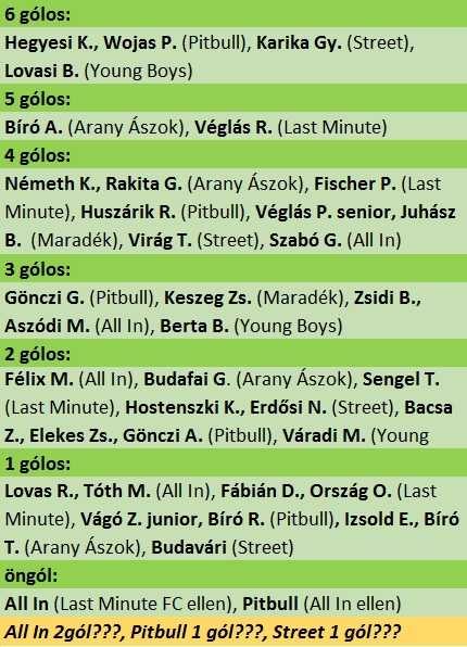 Az eddig nyeretlen Arany Ászok a Pitbullt győzte le könnyedén, míg az utóbbi hetek teljesítménye után némileg váratlan vereséget szenvedett a Maradék a Last Minute ellen. A félidő még 0-0 volt, ám a végét a fiatalok bírták jobban erővel. A találkozó egyébként a Véglás család külön harca is volt.